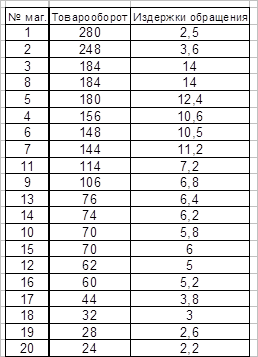 Товарооборот и издержки обращения 20 магазинов объединения за отчётный период (млн.руб.)