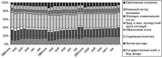 Расходы консолидированного бюджета были профинансированы за 2000 год в сумме 3181145,5 млн. рублей, что составляет 96,0% от уточненного годового плана. В реальном выражении это на 3,9% больше, чем за 1999 год (при росте доходов бюджета за аналогичный период на 12,2%).