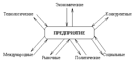 Анализ внешней среды представляет собой процесс, посредством которого разработчики стратегического плана контролируют внешние по отношению к организации факторы, чтобы определить возможности и угрозы для фирмы. Угрозы и возможности, с которыми сталкивается организация, можно выделить в семь областей. Этими областями (факторами) являются экономика, политика, рынок, конкуренция, технология, социальное поведение и международное положение.